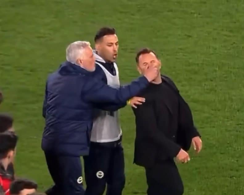 Maç bitiminde ortalık bir anda karıştı! José Mourinho ve Okan Buruk, saha ortasında tokalaşmak için bir araya geldiğinde, Portekizli teknik adam bir anda Buruk’un burnunu sıktı. Bu hareket sonrası Okan Buruk kendini yere bıraktı ve büyük bir tartışma çıktı.