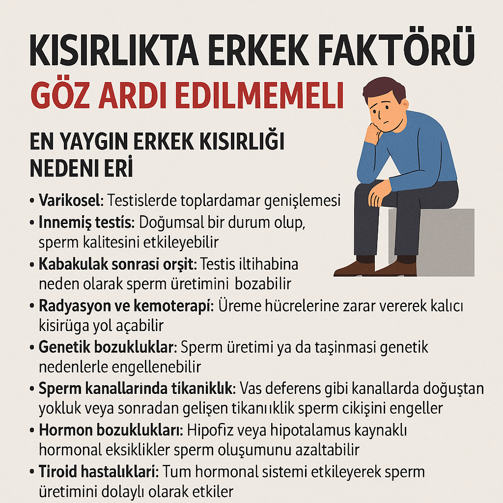 Uzmanlar, erkeklerde kısırlığa yol açabilecek birçok tıbbi ve çevresel faktör bulunduğunu belirtiyor. Bunlar arasında en yaygın olanlar şunlardır: