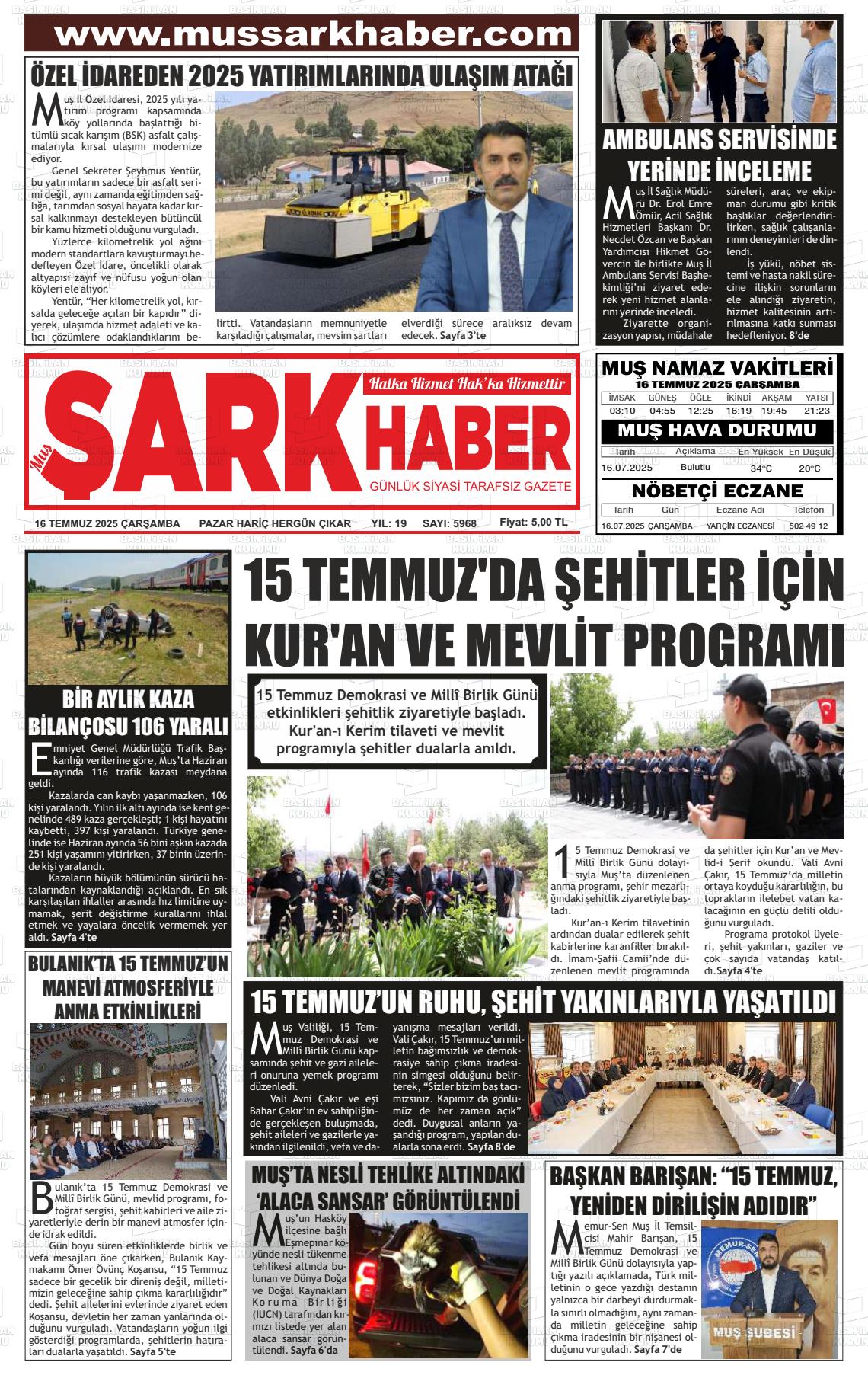 Muş Yerel Gazeteleri 10 Aralık 2025, Çarşamba Günü Manşeti
