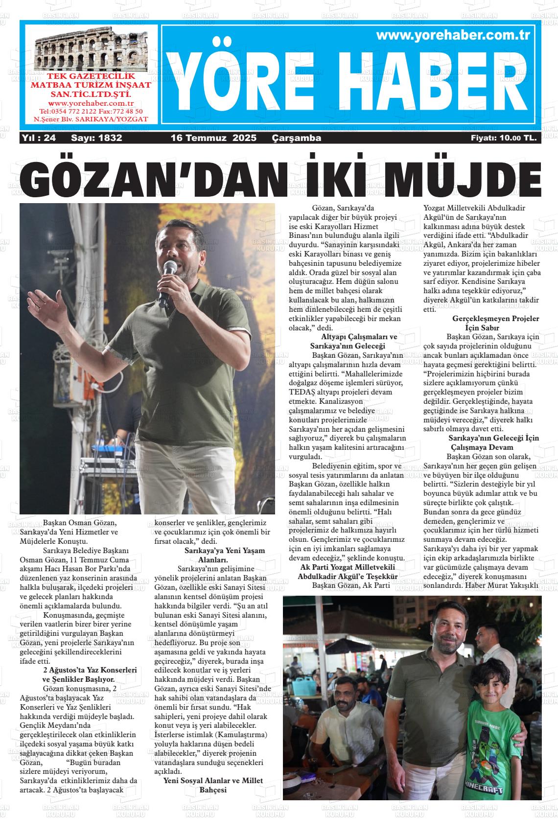 Yozgat Yerel Gazeteleri 11 Aralık 2025, Perşembe Günü Manşeti