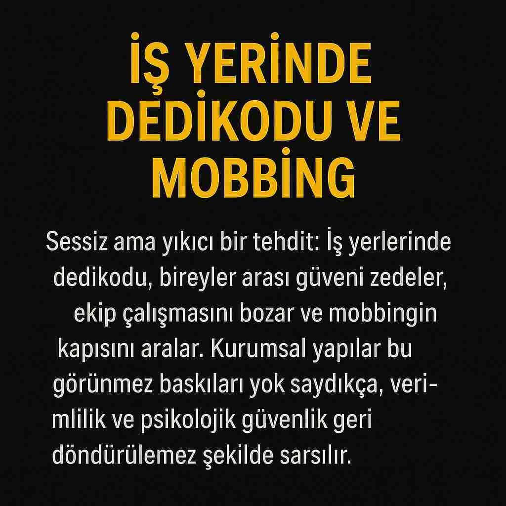 Sonuç Dedikodu ve mobbing, iş ortamlarının en tehlikeli ama en az fark edilen sorunlarındandır. Bunlar, sadece bireyleri değil, kurumun bütün yapısını etkileyen sosyal bir virüstür. Kurumların bu sorunları görmezden gelmesi, uzun vadede daha büyük krizlere neden olabilir. Çalışanların güvende hissettiği, açık iletişimin olduğu ve adaletin sağlandığı iş ortamlarında ise hem moral hem de performans üst düzeyde olacaktır. Bu nedenle, dedikodunun ve mobbingin üstüne cesurca gidilmeli ve her seviye bu konuda sorumluluk almalıdır.