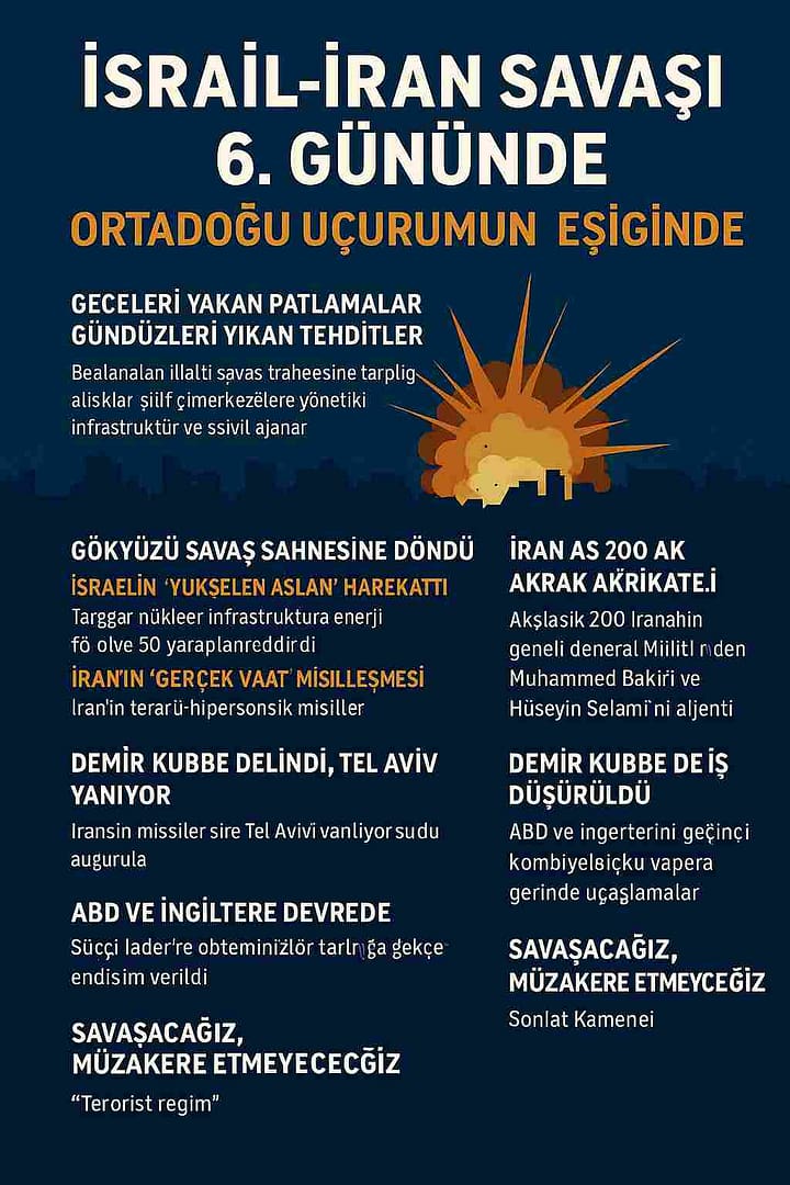 13 Haziran’da başlayan ve giderek derinleşen İsrail–İran savaşı altıncı gününe girdi. Başlangıçta yalnızca askeri üslerin hedef alındığı saldırılar, artık şehir merkezlerini, enerji altyapısını ve sivil bölgeleri içine alacak şekilde genişlemiş durumda. Ortadoğu’da korku ve kaos hakim.