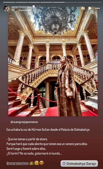 Arjantinli model China Suarez, Osmanlı tarihine ve saray kültürüne büyük bir ilgi duyduğunu yaptığı paylaşımlarla gösterdi. Dolmabahçe Sarayı gezisi sırasında Hürrem Sultan’a atfedilen şu sözleri paylaşarak takipçilerine Osmanlı tarihine olan ilgisini gösterdi: